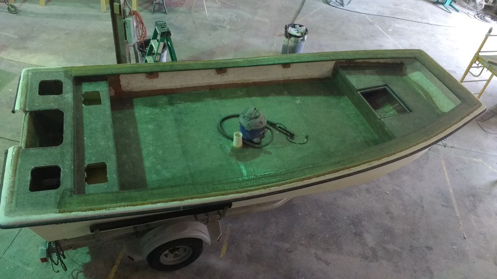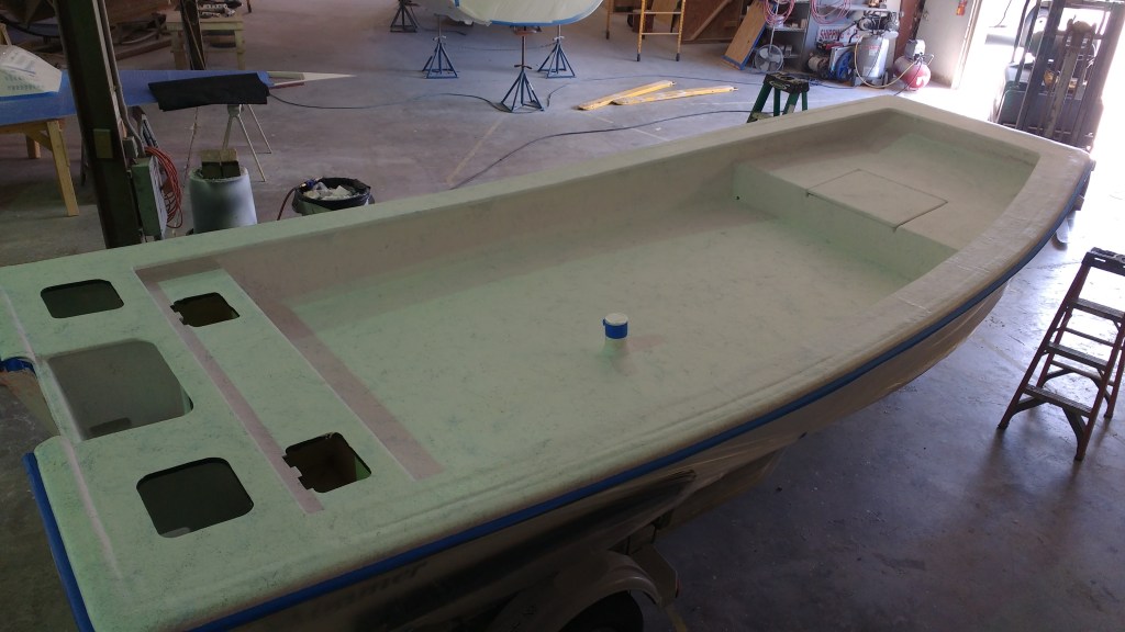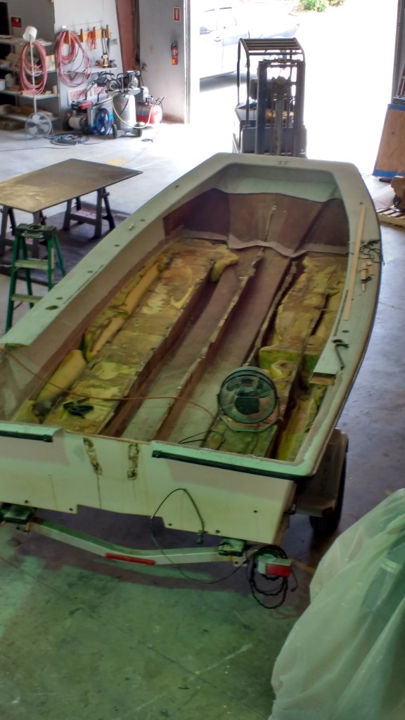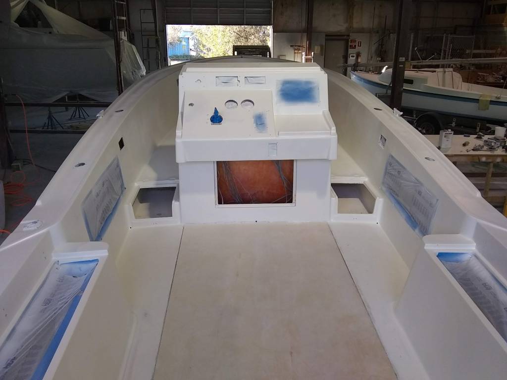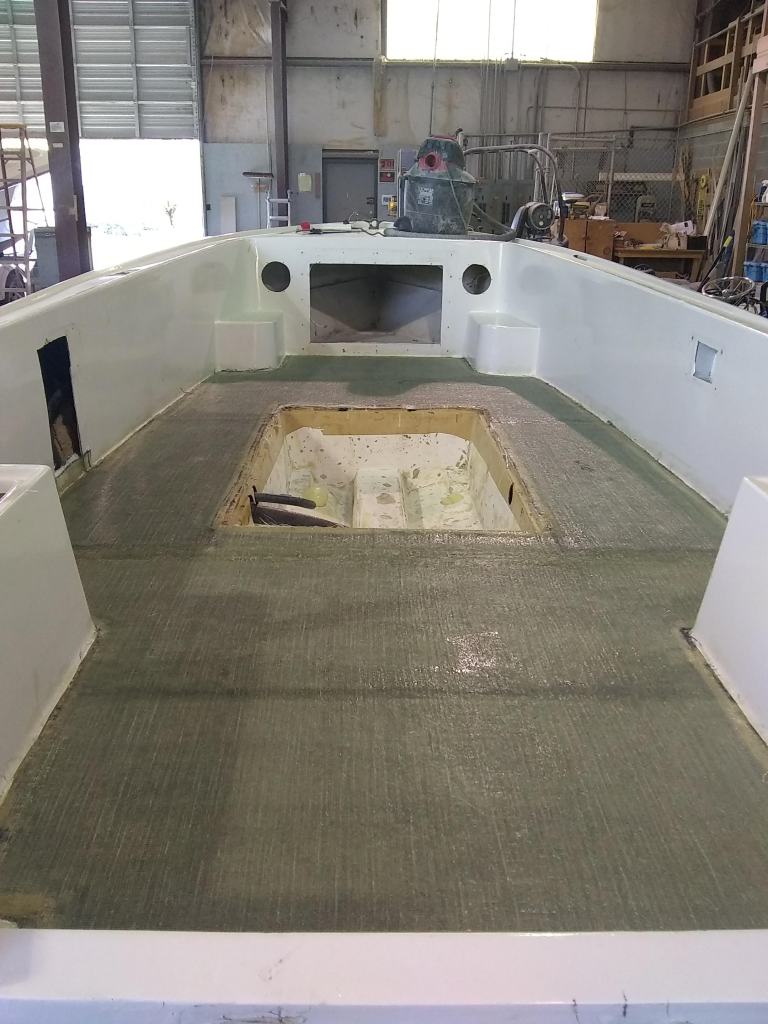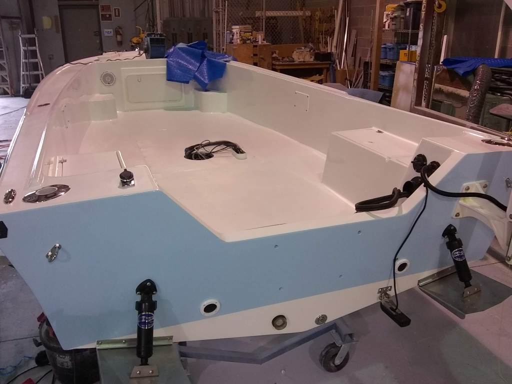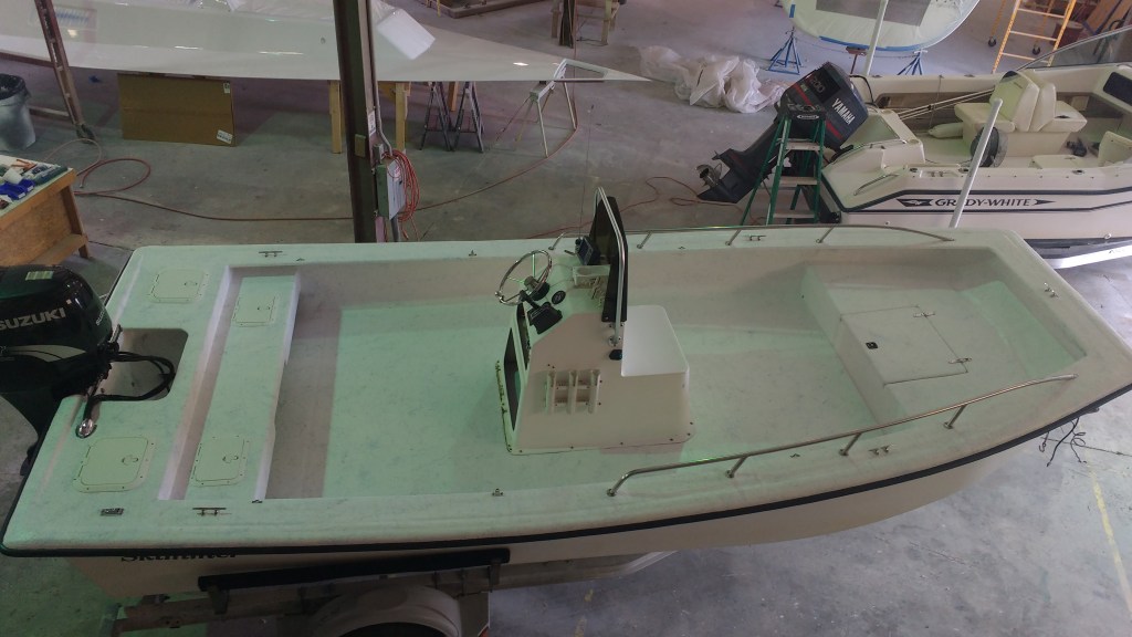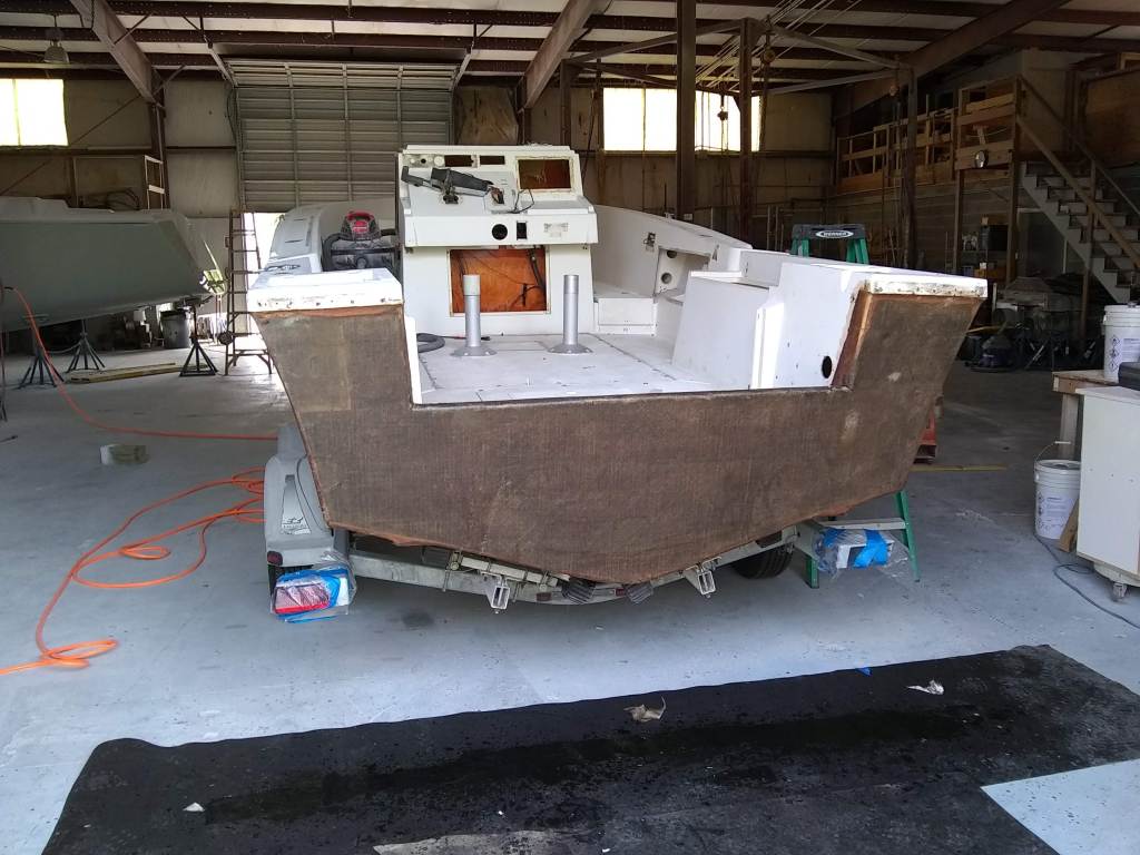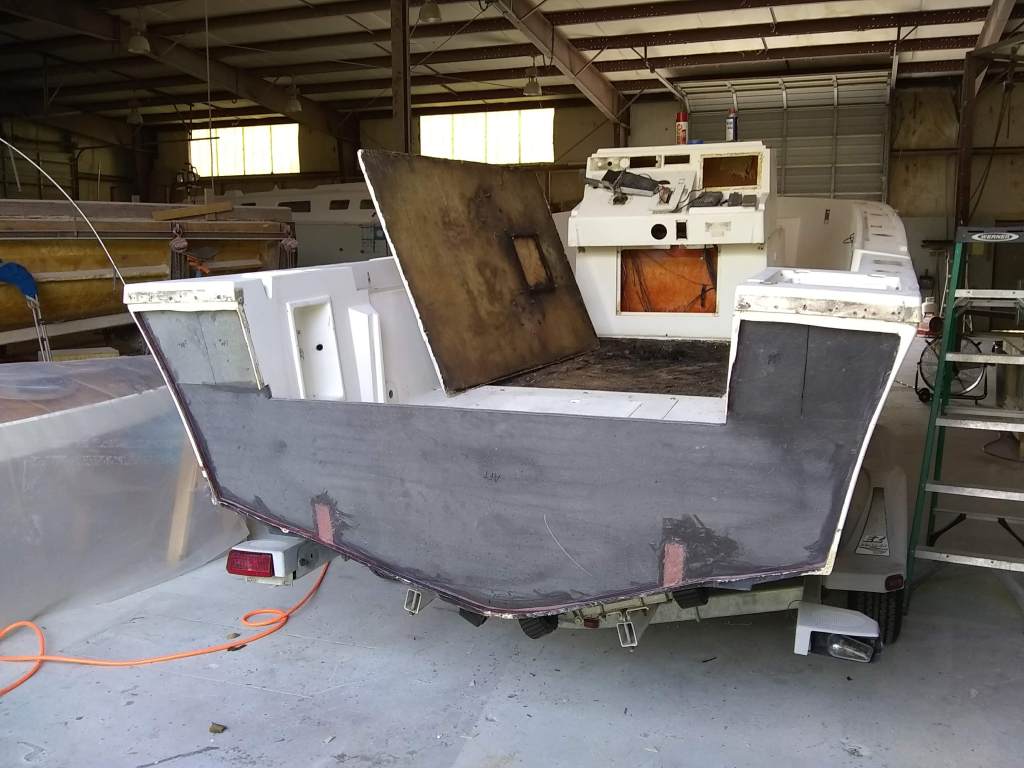 19 foot Sea Skimmer. Extensive rebuild. Removed all rotten plywood that was used as core material. Rebuilt with carbon core board and fiberglass. New transom, main,front, side and rear decks. Custom flush fore deck hatch. New interior gelcoat with colored web effect.