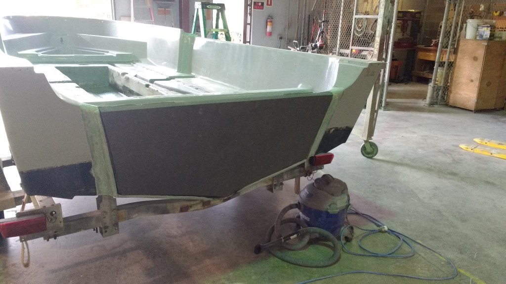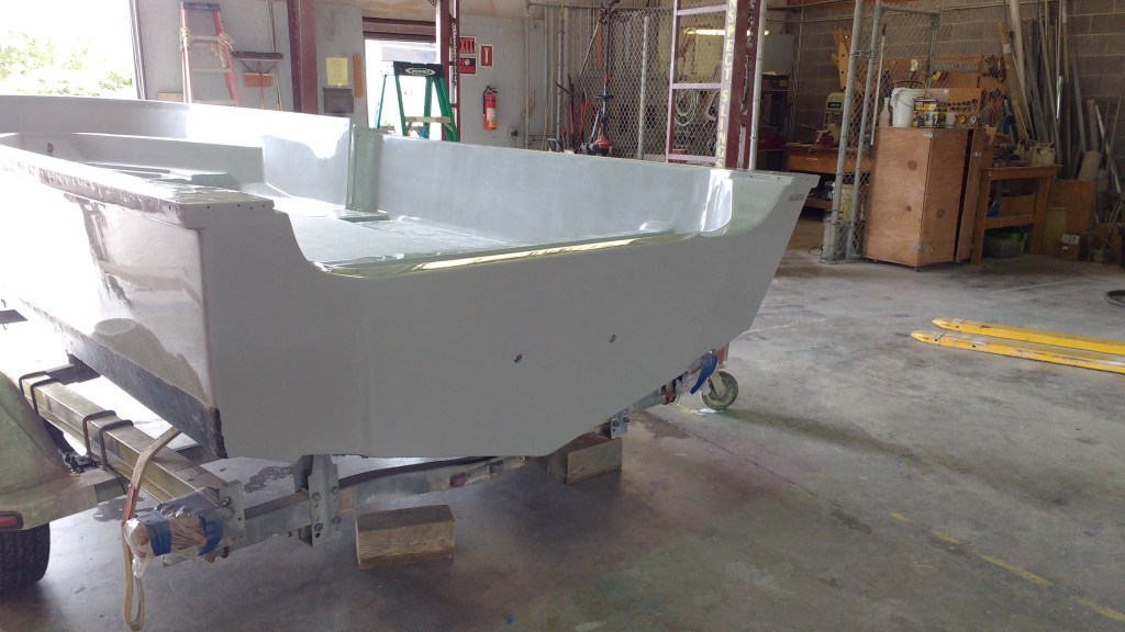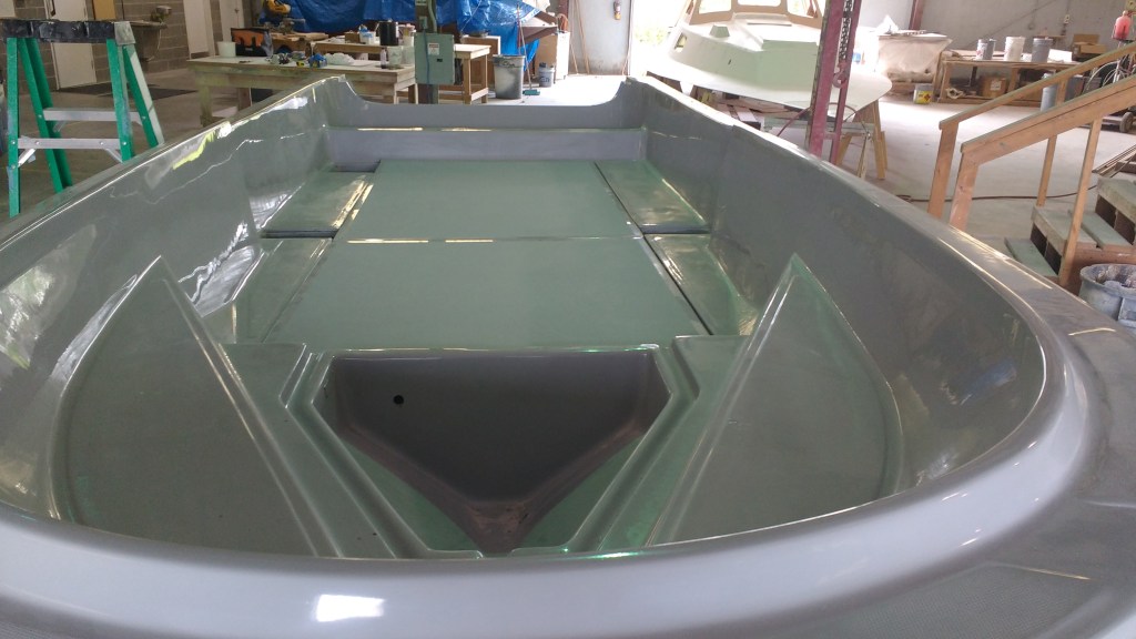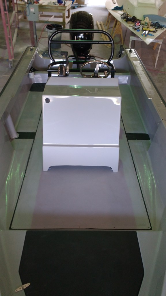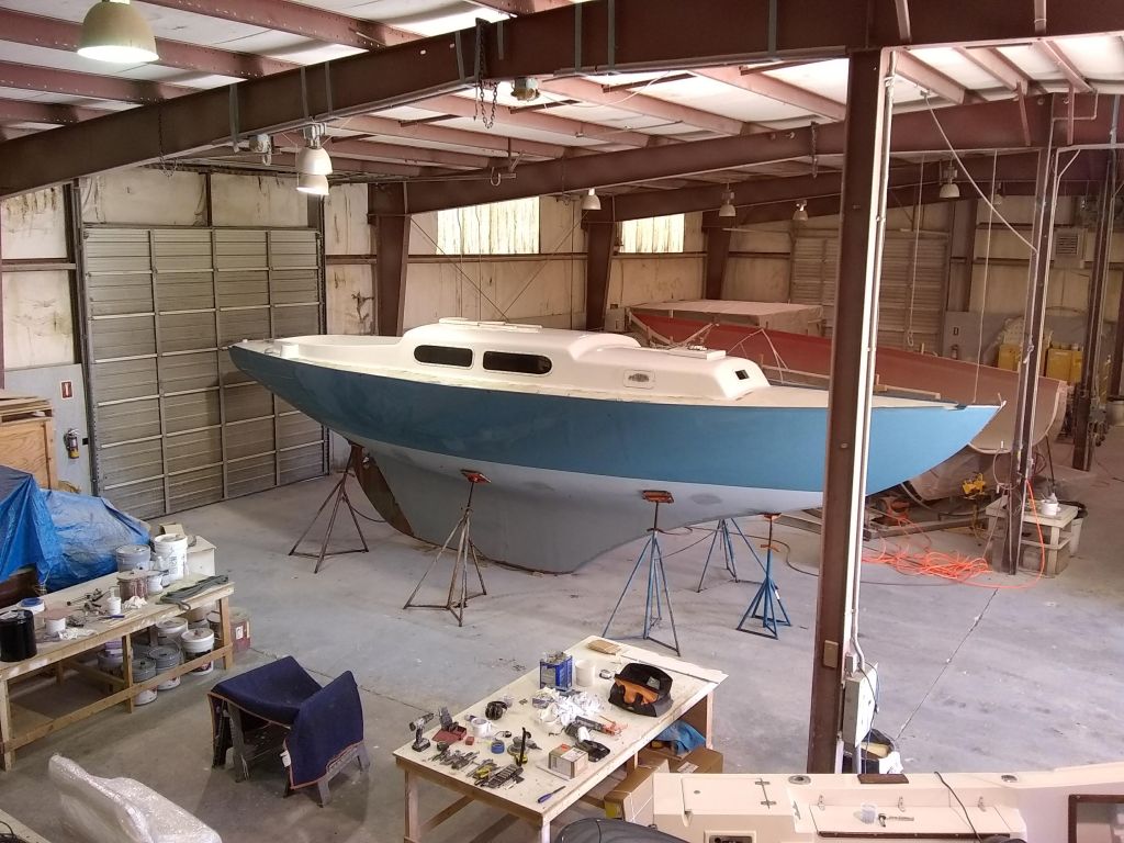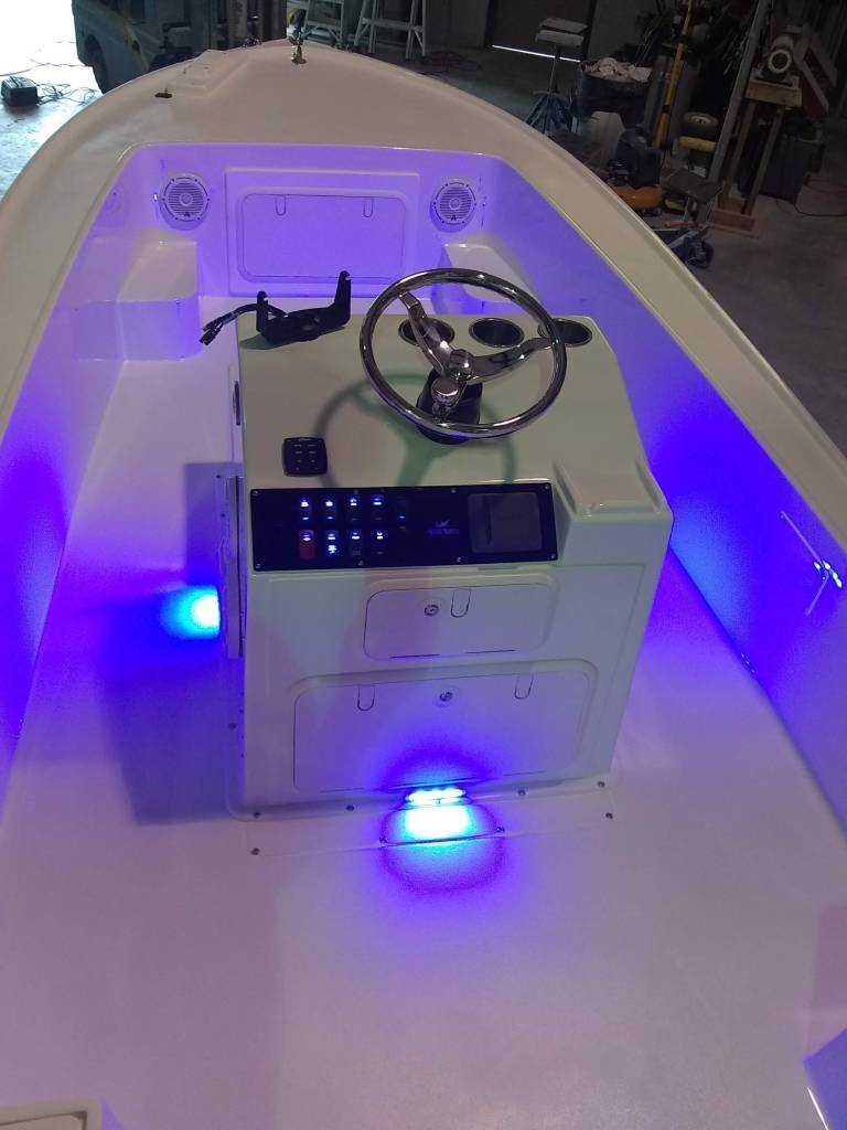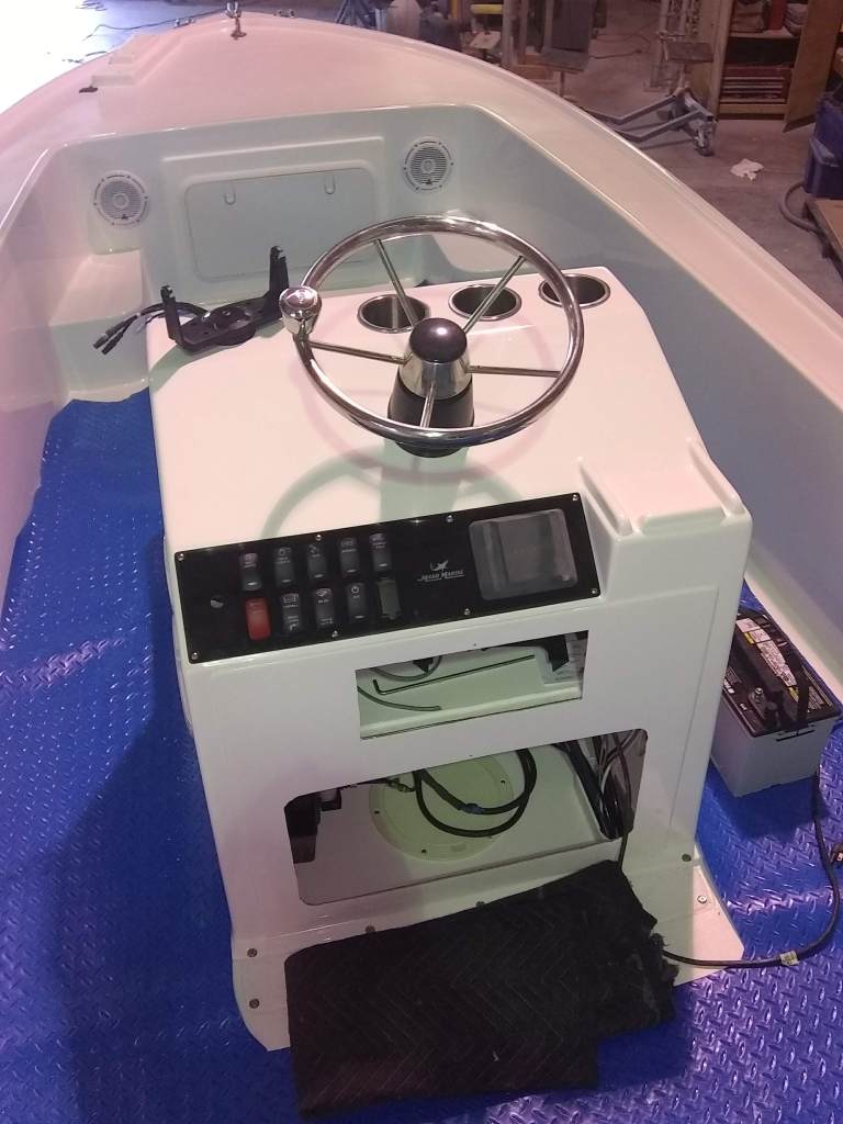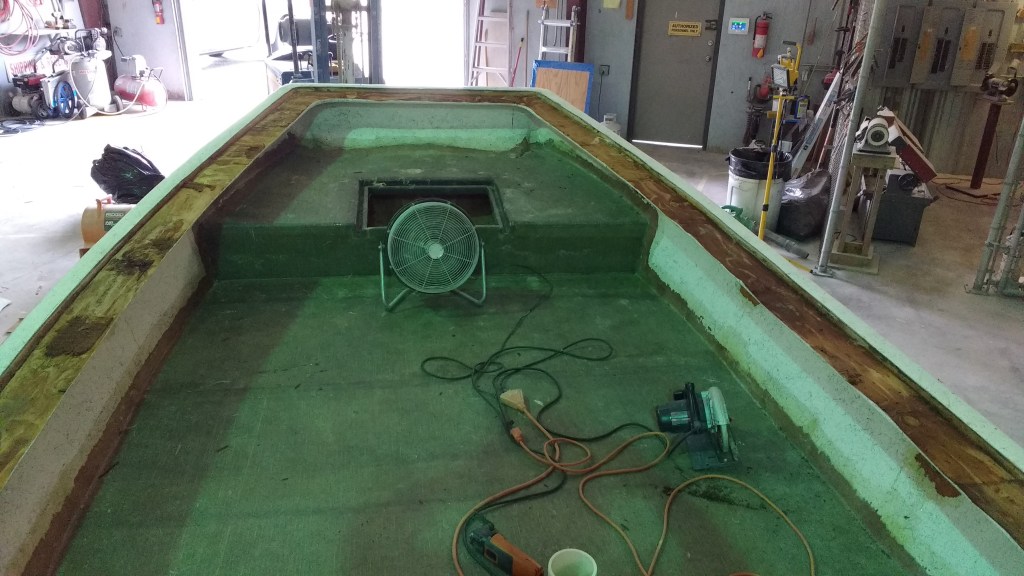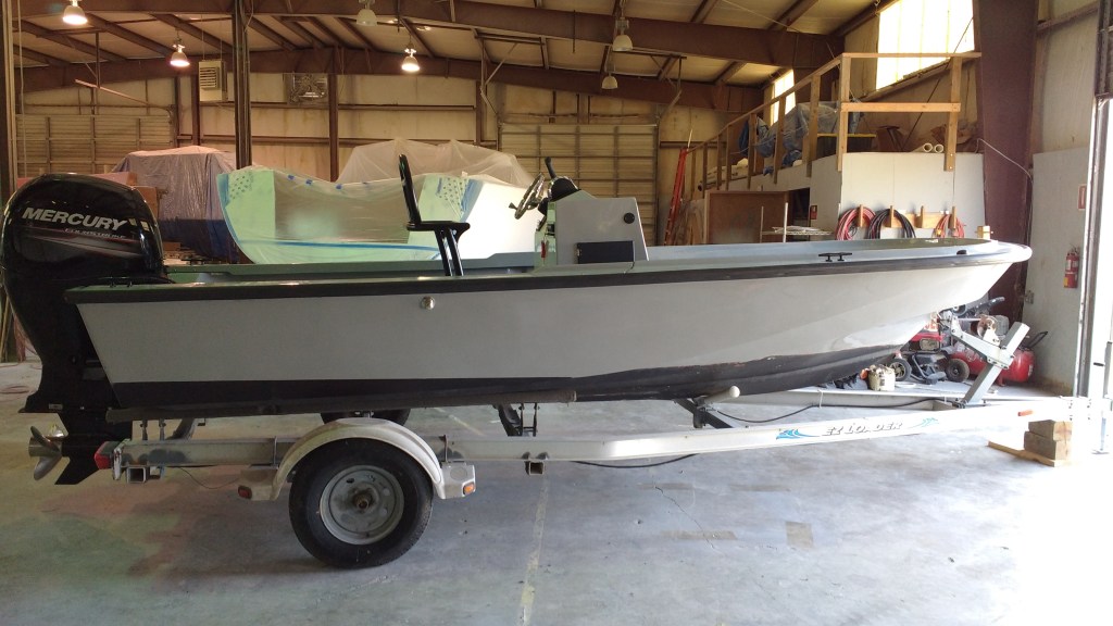 19 foot Sea Skimmer. Extensive rebuild. Removed all rotten plywood that was used as core material. Rebuilt with carbon core board and fiberglass. New transom, main,front, side and rear decks. Custom flush fore deck hatch. New interior gelcoat with colored web effect.
